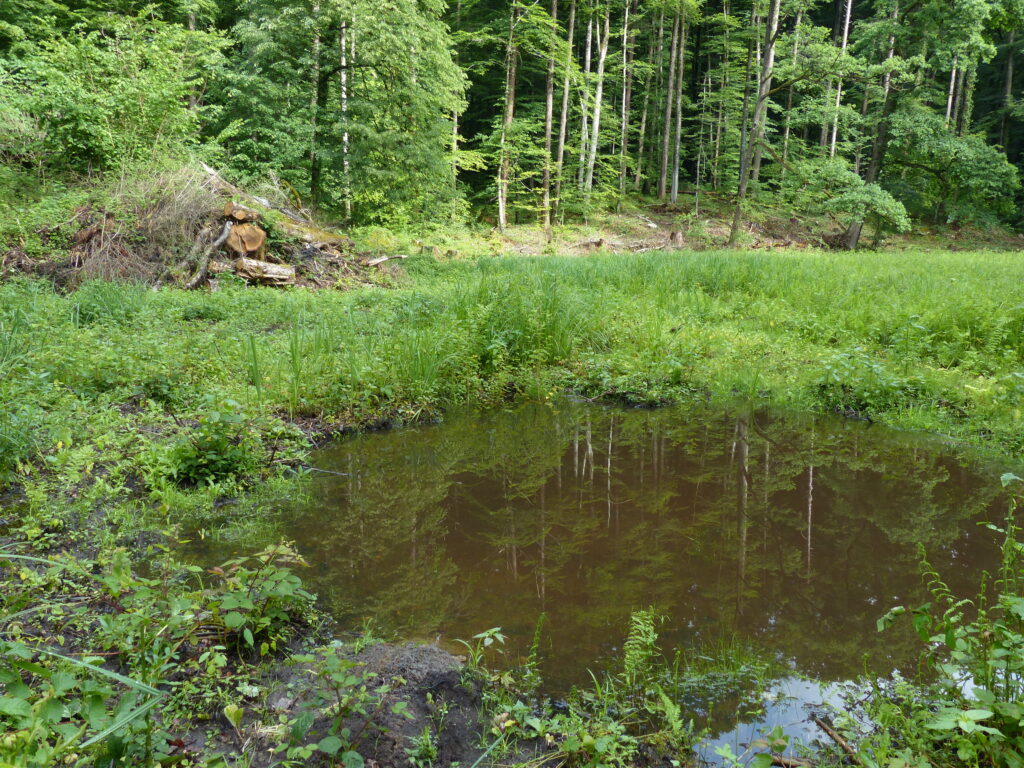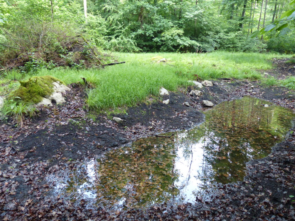 Im Schlosswald bei Salez prägten noch vor rund 100 Jahren zahlreiche kleine Lichtungen mit Feuchtgebieten das Landschaftsbild. Heute sind viele dieser wertvollen Lebensräume zugewachsen, sodass Amphibien zunehmend geeignete Entwicklungs- und Rückzugsorte fehlen.