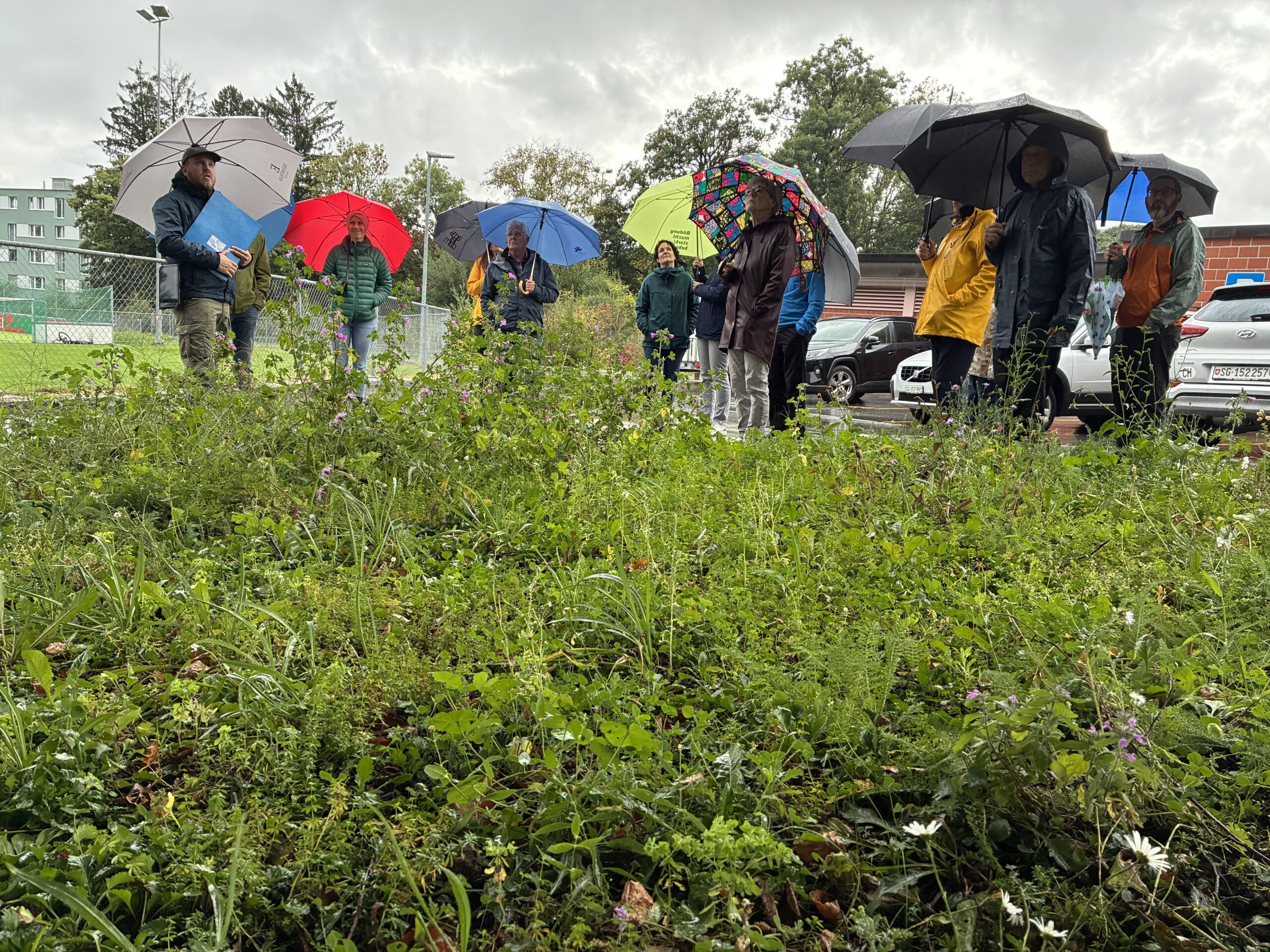 Mit Regenschirmen ausgerüstet und offenen Augen entdeckten die Teilnehmenden, wie viel Natur im vermeintlich Alltäglichen steckt – und wie jede und jeder einen Beitrag zur Förderung der Biodiversität leisten kann. Fachliche Inputs, praktische Tipps und der Austausch unter Gleichgesinnten machten den Spaziergang zu einem informativen und inspirierenden Erlebnis.
