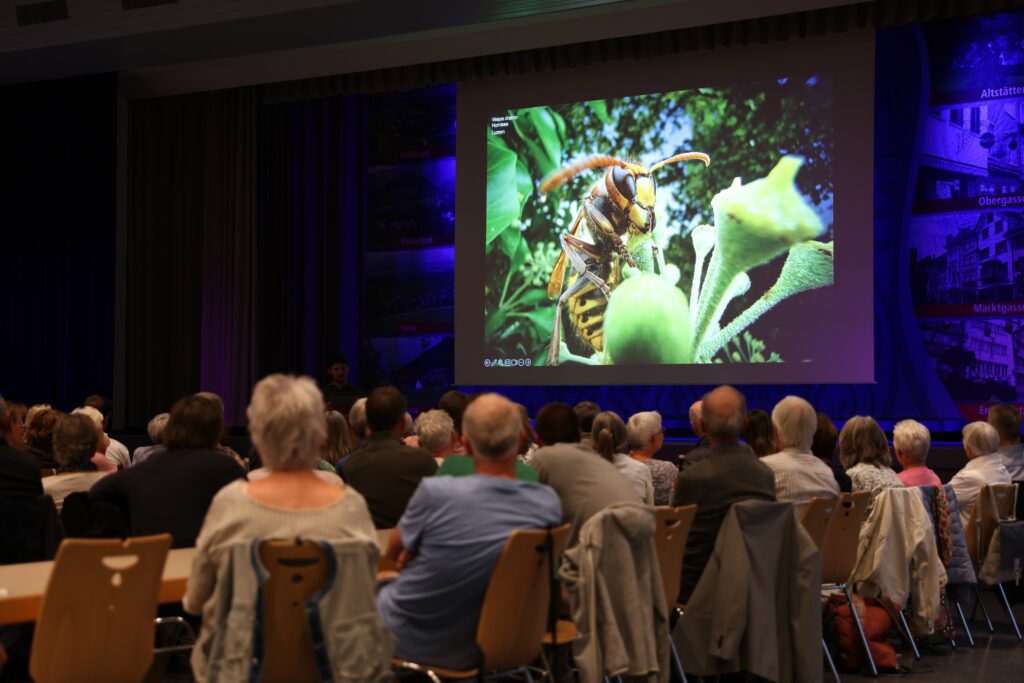 Schon die ersten Bilder sorgten für begeisterte Gesichter. Spektakuläre Makroaufnahmen brachten winzige Insekten ganz gross heraus: schillernde Sechsfleck-Widderchen, leuchtende Holzbienen oder Zwergharzbienen, die sich zum Schlafen an Pflanzen festkrallen. Besonders fasziniert ist der 32-jährige Luzerner auch von Spinnen. Wespenspinnen, Kreuzspinnen oder Springspinnen füllten die Leinwand in atemberaubender Schärfe. Die Bilder enthüllten Strukturen und Farben, die dem blossen Auge sonst verborgen bleiben, und liessen selbst erfahrene Naturbeobachter staunen. Auch der Humor kam nicht zu kurz: Als Willi Nahaufnahmen von einer Mücke und einer Zecke zeigte, die ihn gestochen hatten, ging ein Lachen durch den Saal – so ruhig kriegt man die Insekten sonst schliesslich kaum aufs Bild.